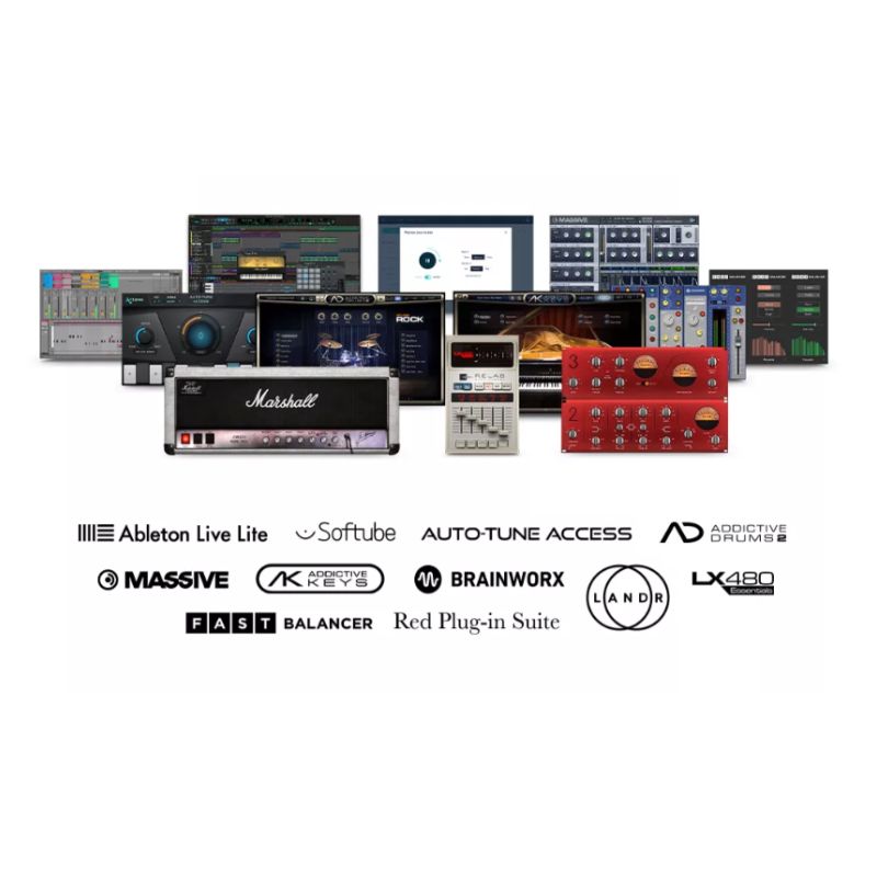- 4 x Clarett+ Preamps (via combo XLR-1/4″ inputs, two with Hi-Z for instruments)