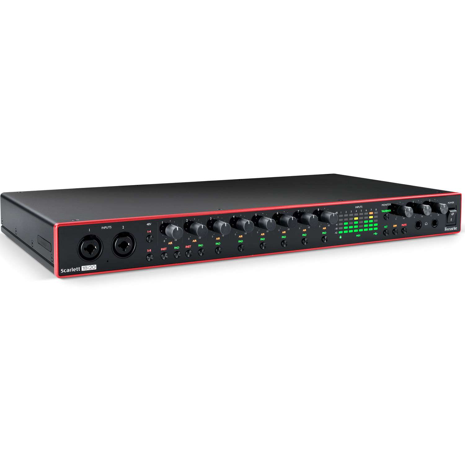 The eight improved Scarlett microphone preamps feature switchable phantom power, input pads, and selectable Air circuits, which add brightness based on Focusrite’s legendary ISA preamplifier.