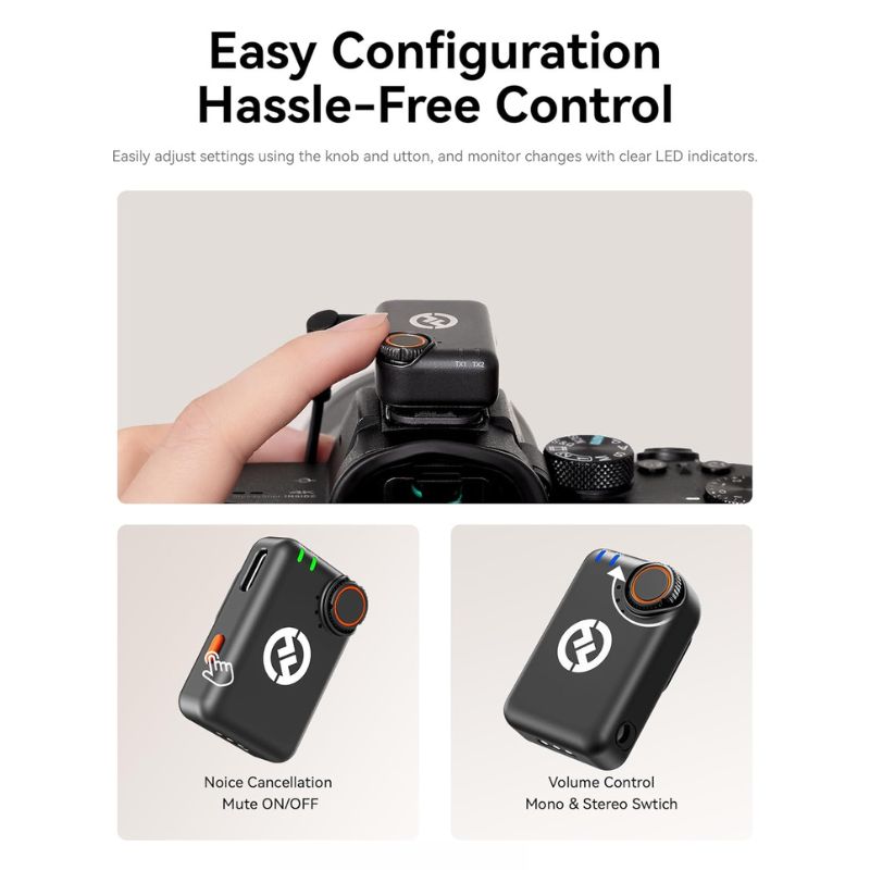- One-Click Environmental Noise Cancellation (ENC): A dedicated button on the transmitter allows for quick and easy activation of the intelligent noise cancellation feature. This effectively filters out distracting background noise, such as traffic, wind, or air conditioning, ensuring your voice is clear and prominent in the final recording.