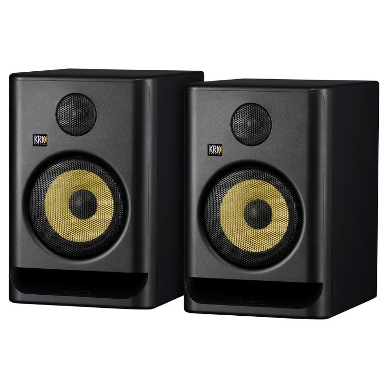 The KRK Rokit 7 G5 is a 7-inch powered studio monitor designed for both nearfield and midfield applications. It features a 7″ woven Kevlar aramid fiber woofer and a 1″ silk dome tweeter, delivering a frequency response of 45 Hz – 36 kHz.