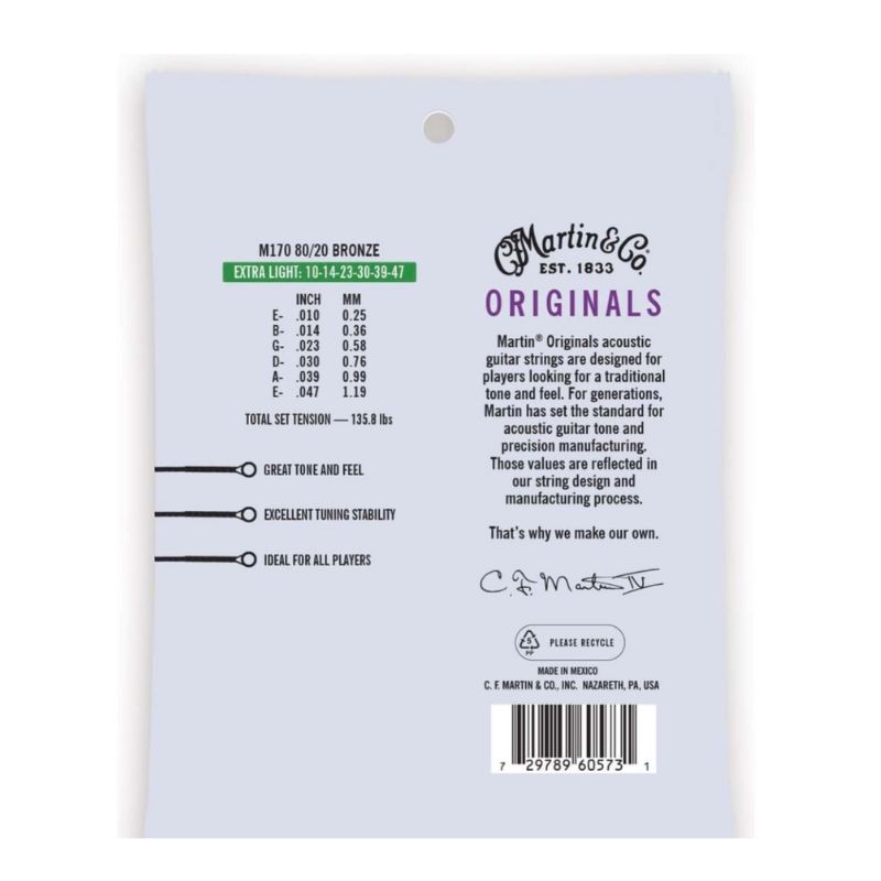 Martin M170 strings are part of Martin’s Originals line — simple, traditional, great for everyday use, beginners or anyone who wants bright, easy-to-play acoustic strings. They’re extra light gauge and suited for a wide range of styles from folk and blues to rock and country.