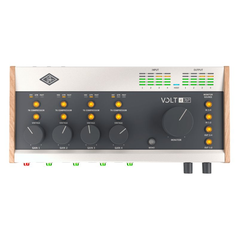 Plug mics, guitars, or synths into the Volt 476P’s four mic / line / Hi-Z preamps and press the Vintage switches to impart the pleasing character of an emulated UA vintage 610 tube preamp to your voice or instrument. Keep peaks under control while adding punch with three selectable presets of 1176-like analog compression. Direct monitoring lets you hear yourself with no distracting latency, and there are separate volume controls for the speaker and the two headphone outputs.