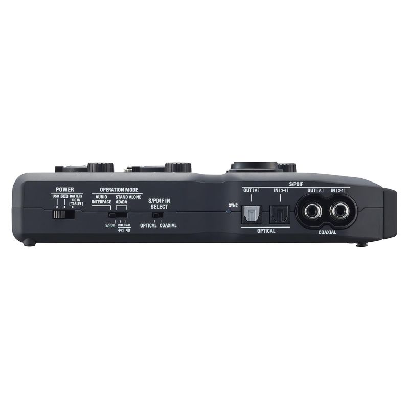Zoom U 44 Handy 4 Audio Interface features two TRS/XLR combo jacks for inputs, in/out S/PDIF Optical Toslink and S/PDIF Coaxial on RCA, MIDI In/Out, two TRS 1/4″ unbalanced jack outputs, RCA line-level outputs and a standard stereo headphone jack.